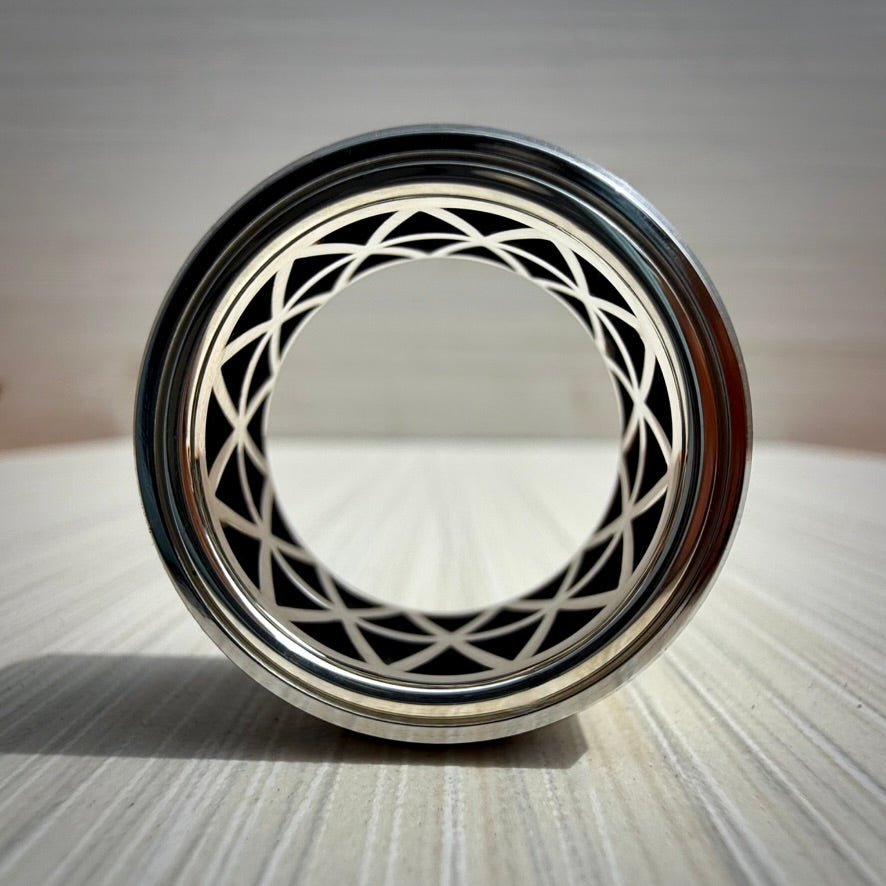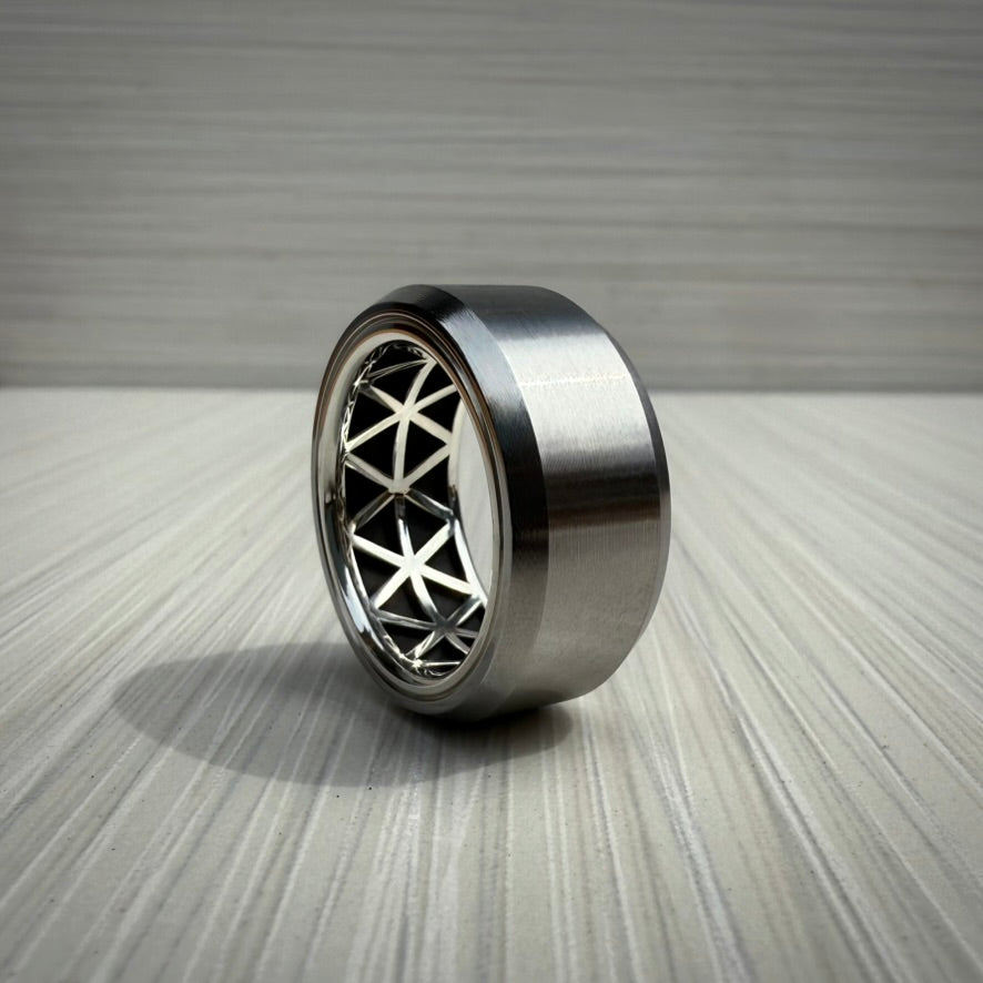 The Stratos ring is where clean minimalism meets aerospace-grade design. Precision-machined from brushed stainless steel, its outer surface is bold and monolithic — a modernist silhouette with industrial intent. But within, the true innovation reveals itself: a geometric space frame core inspired by the structural isogrids found in spacecraft and satellites.